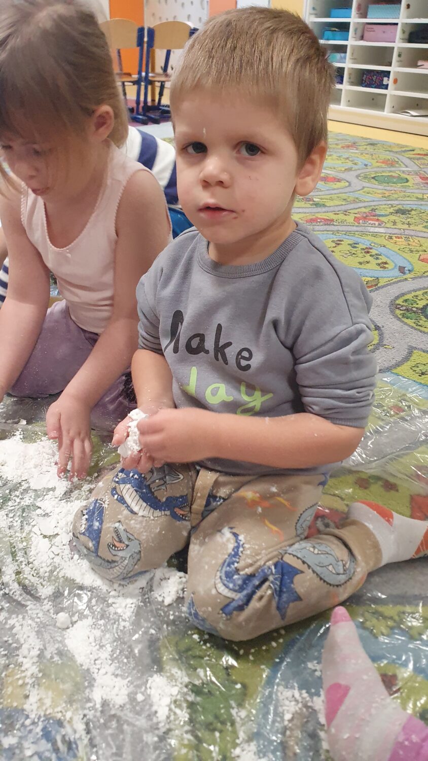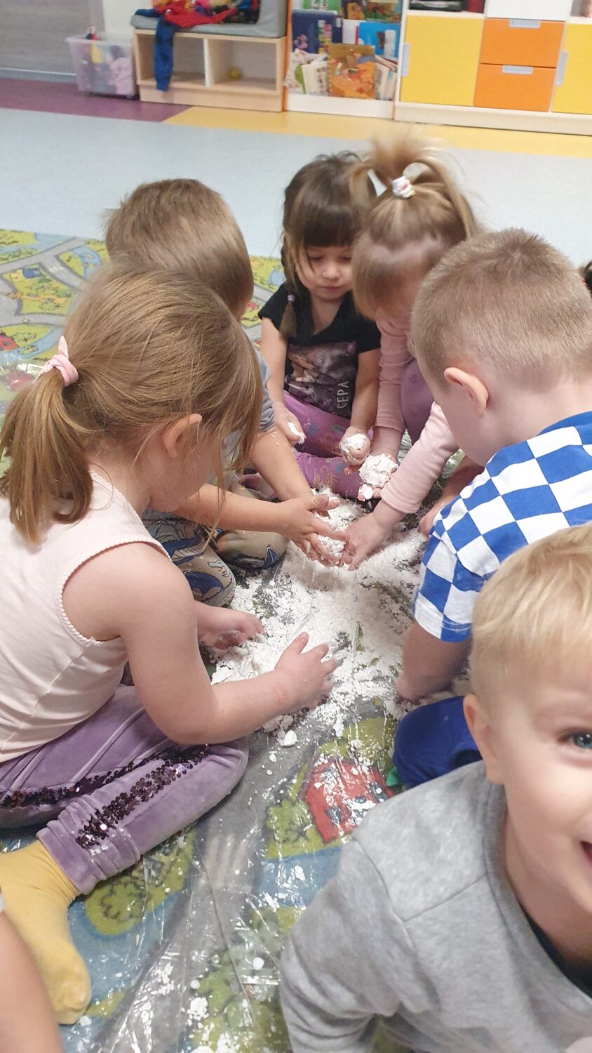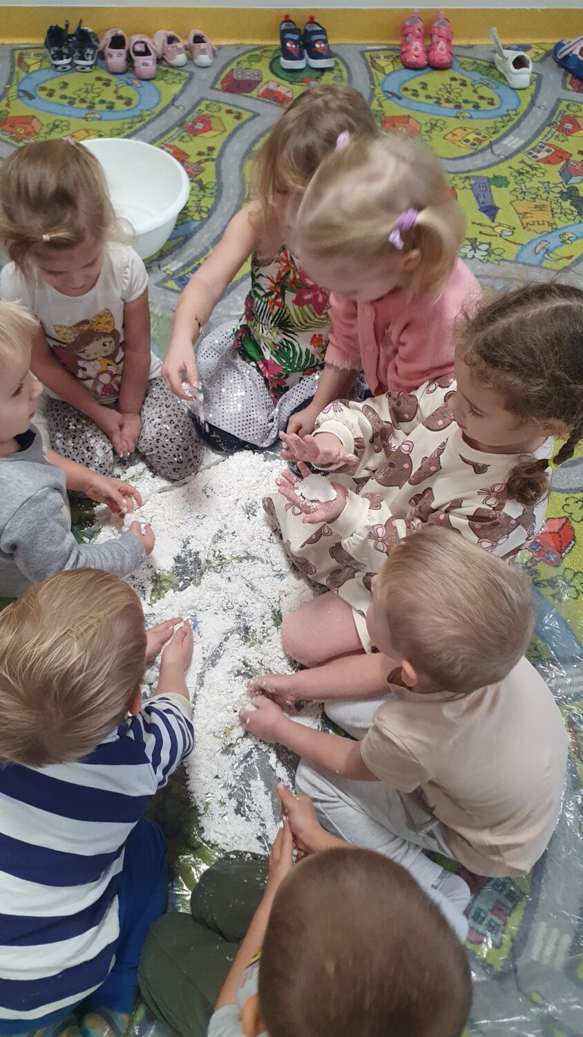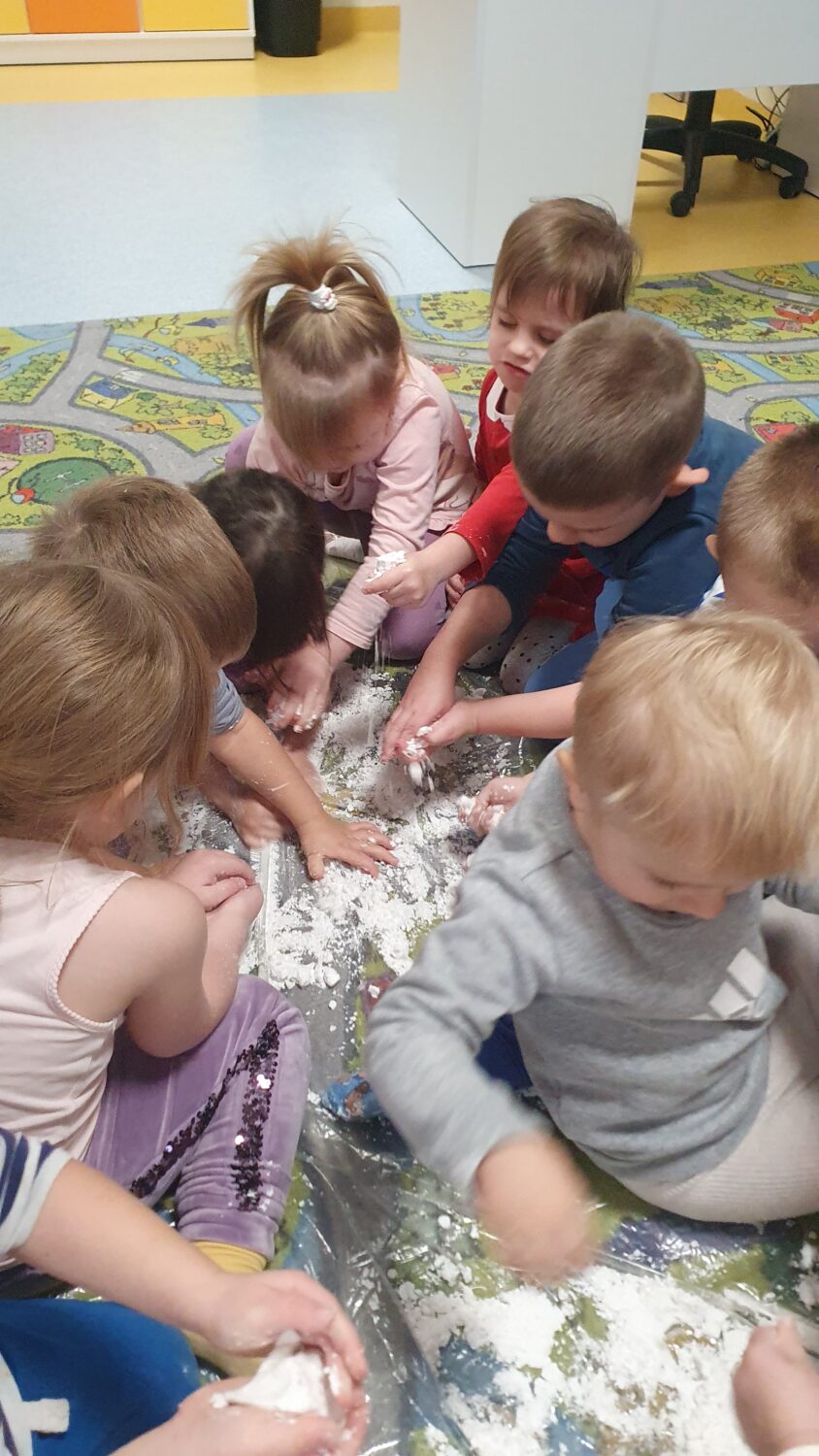 Dziś motylki miały bardzo ciekawe zajęcia sensoryczne. Wspólnie z Panią Kasią robiły…śnieg. Zabawa nie miała końca, bo kiedy nie ma śniegu zróbmy go sami. 🙂