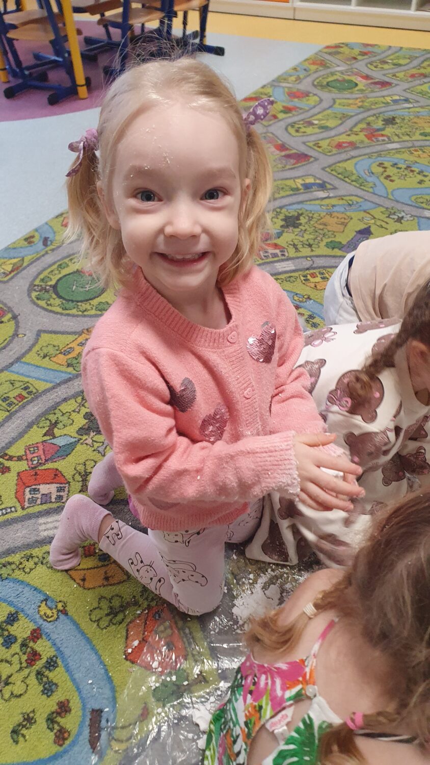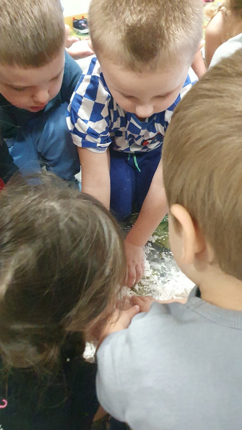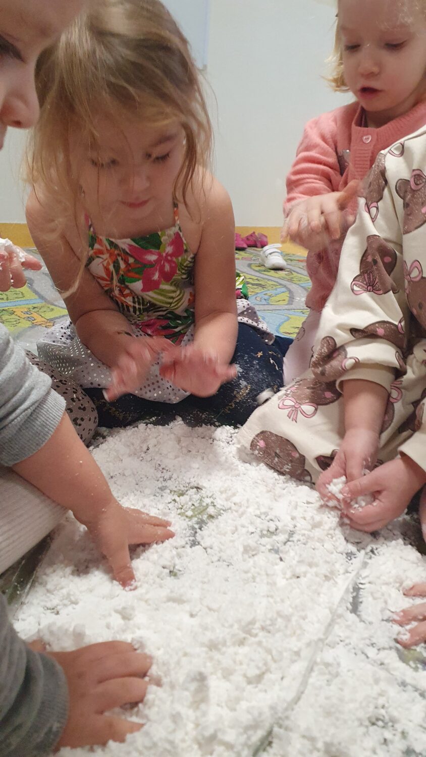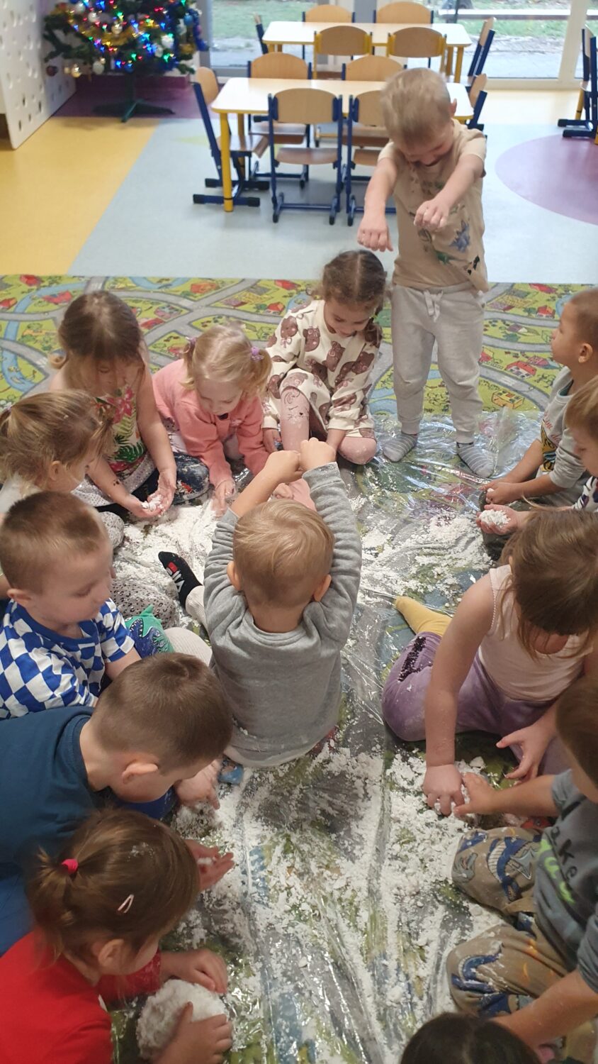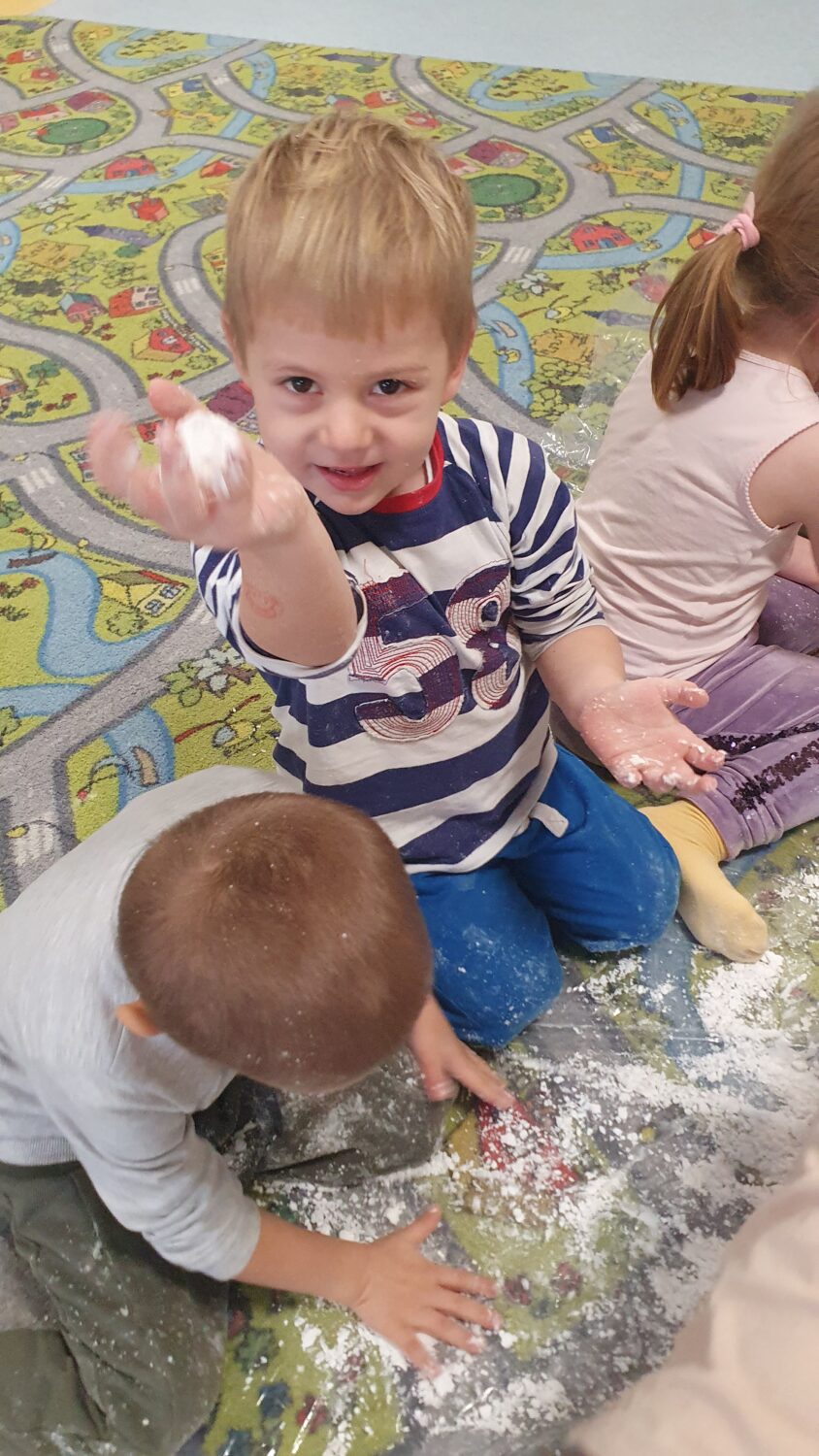 Dziś motylki miały bardzo ciekawe zajęcia sensoryczne. Wspólnie z Panią Kasią robiły…śnieg. Zabawa nie miała końca, bo kiedy nie ma śniegu zróbmy go sami. 🙂