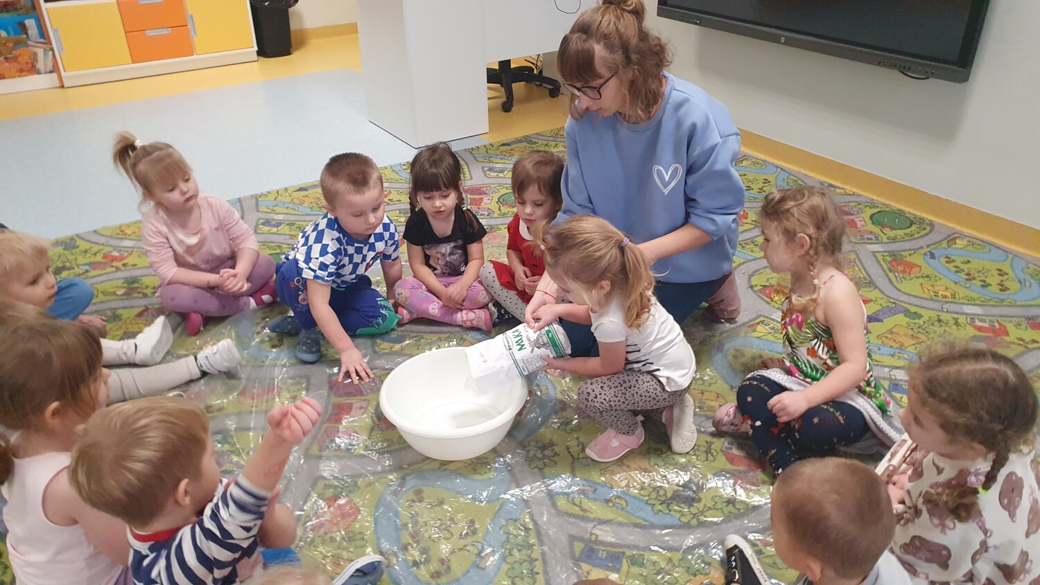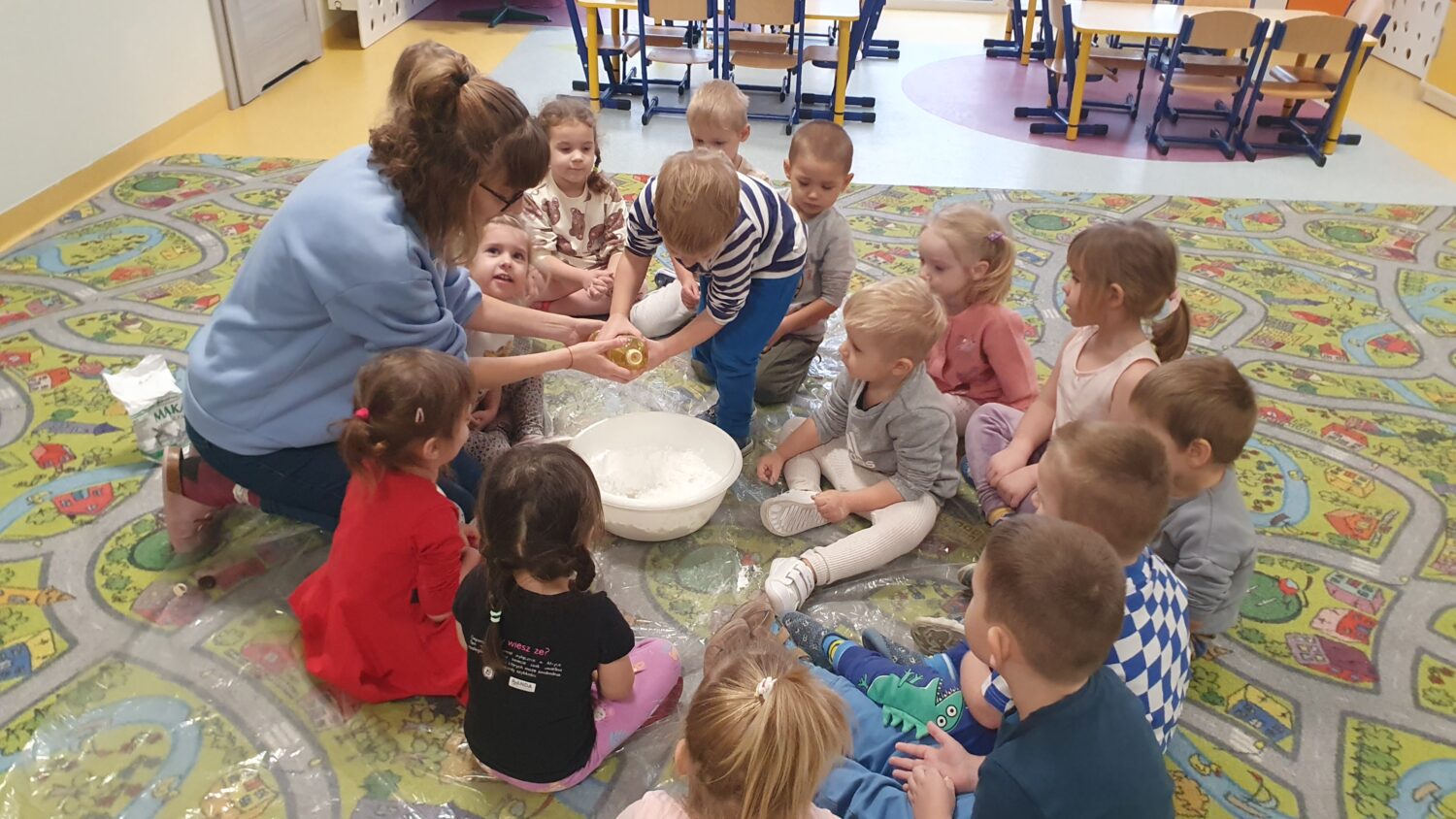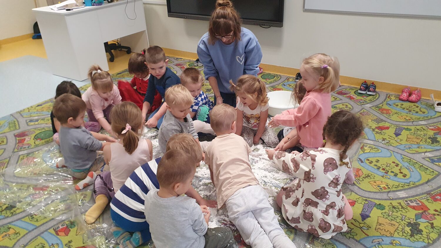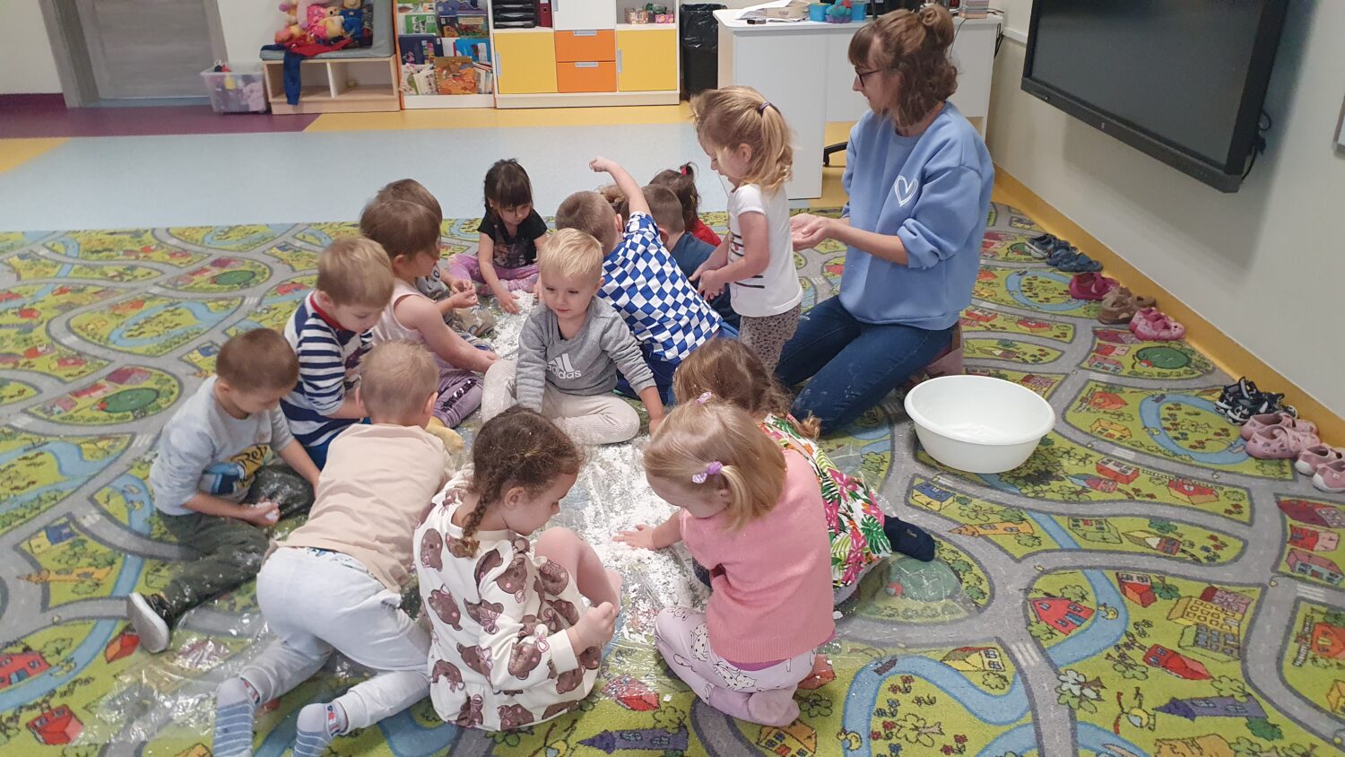 Dziś motylki miały bardzo ciekawe zajęcia sensoryczne. Wspólnie z Panią Kasią robiły…śnieg. Zabawa nie miała końca, bo kiedy nie ma śniegu zróbmy go sami. 🙂