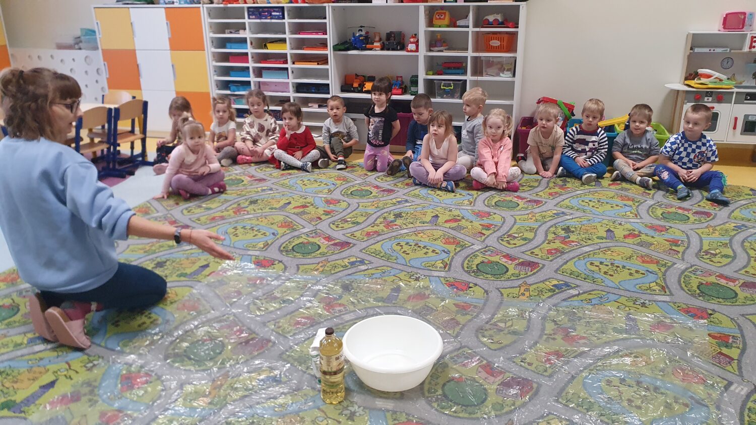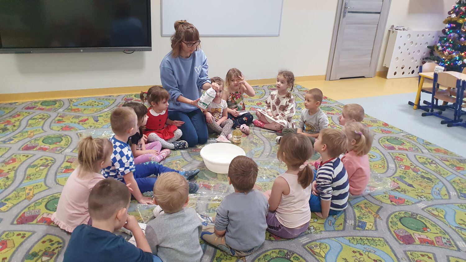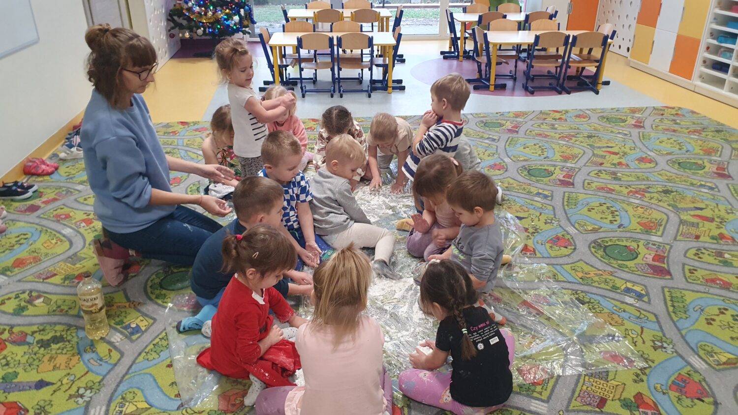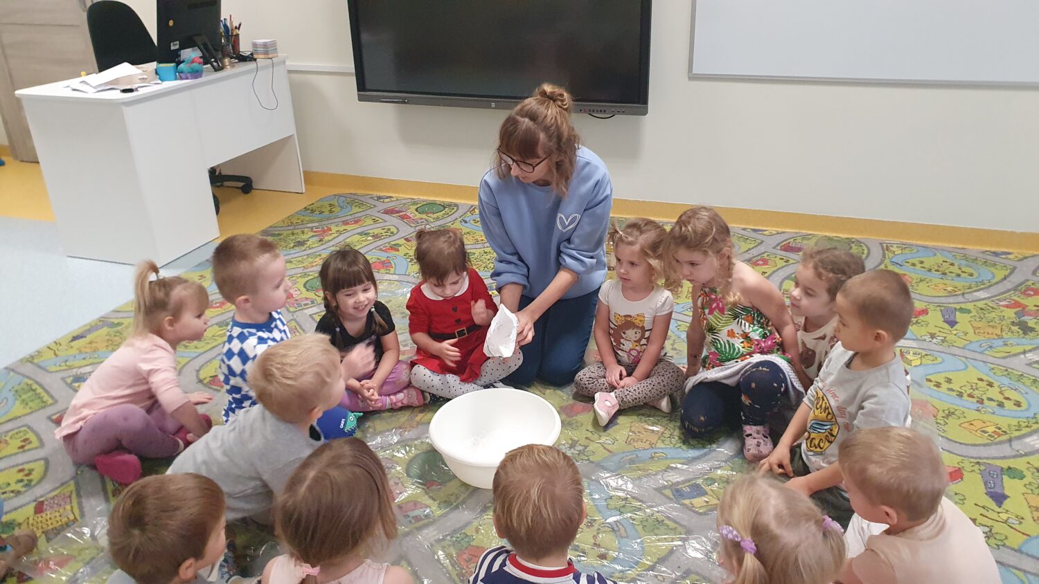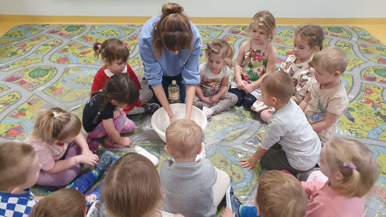 Dziś motylki miały bardzo ciekawe zajęcia sensoryczne. Wspólnie z Panią Kasią robiły…śnieg. Zabawa nie miała końca, bo kiedy nie ma śniegu zróbmy go sami. 🙂