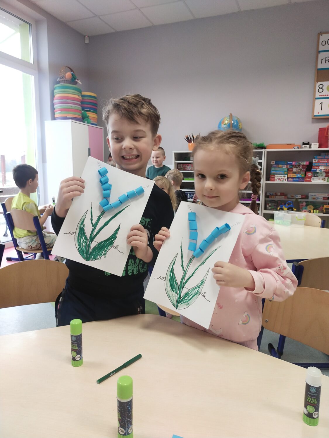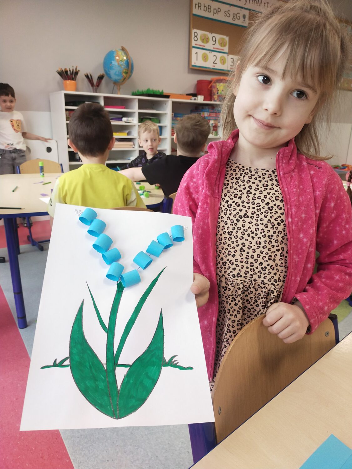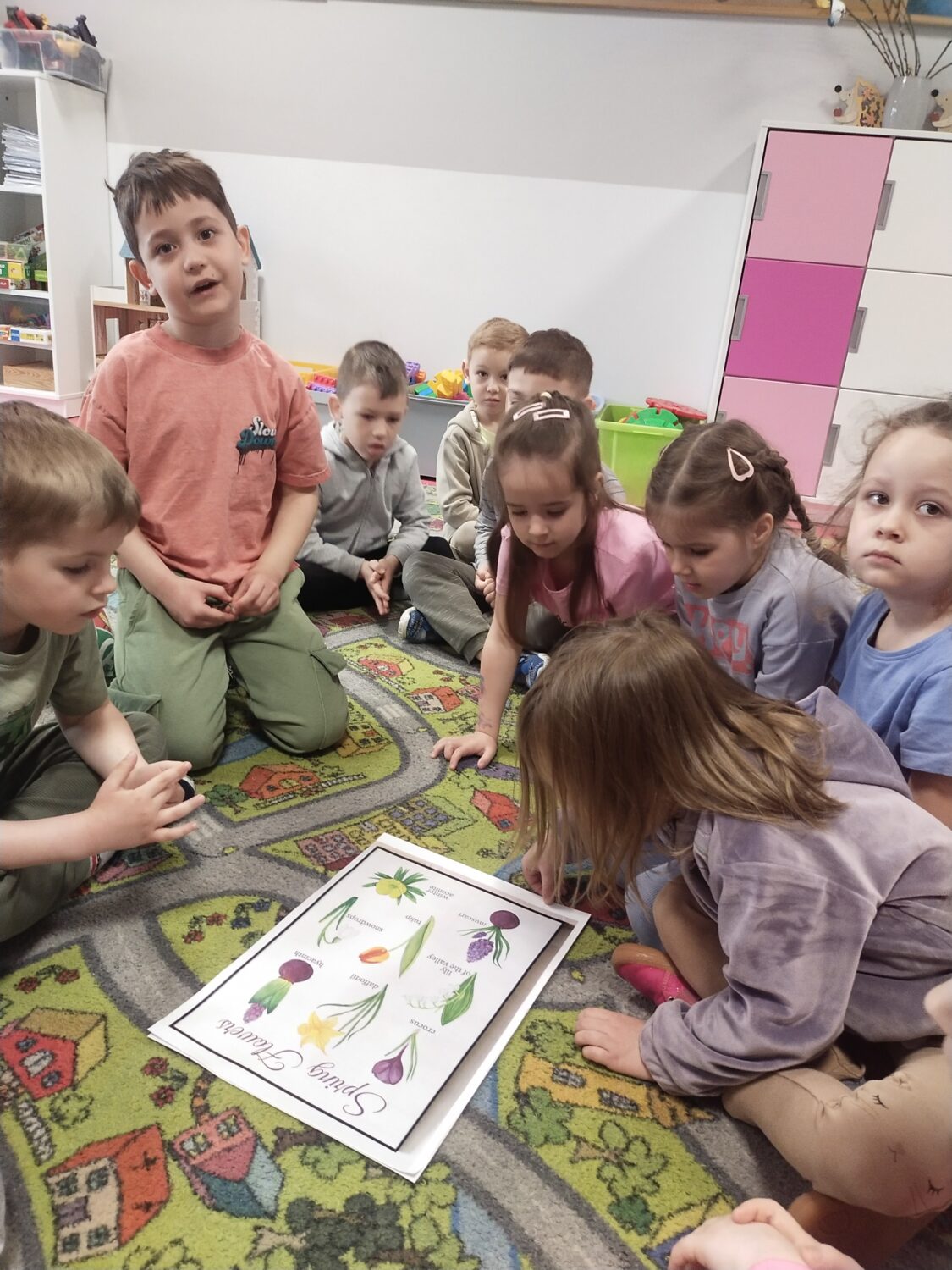 Uczymy się przedstawiać w języku angielskim, ćwicząc w parach frazy: „Hello! What’s your name? My name is… Nice to meet you”. Poznajemy także nazwy wiosennych kwiatów w języku angielskim 🌷 i wykonujemy jeden z nich – grape hyacinth 🪻