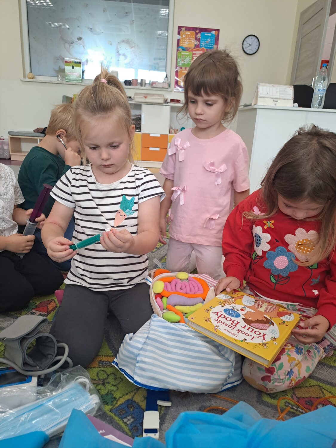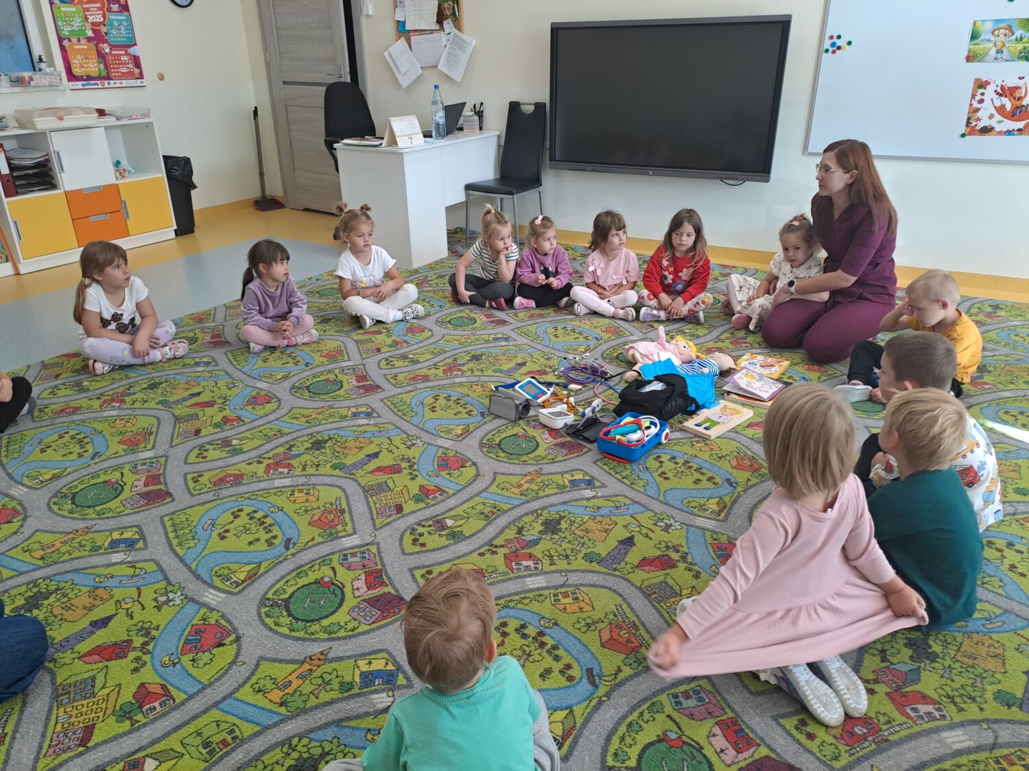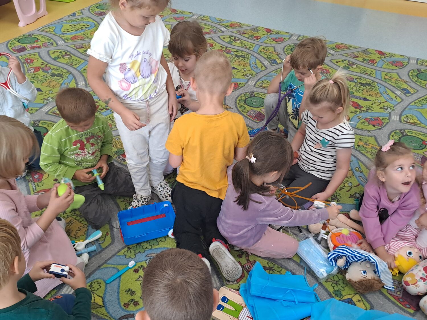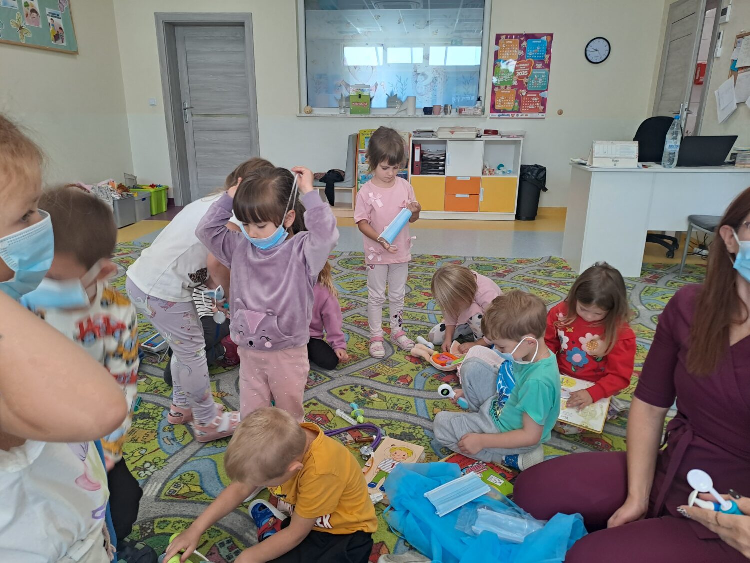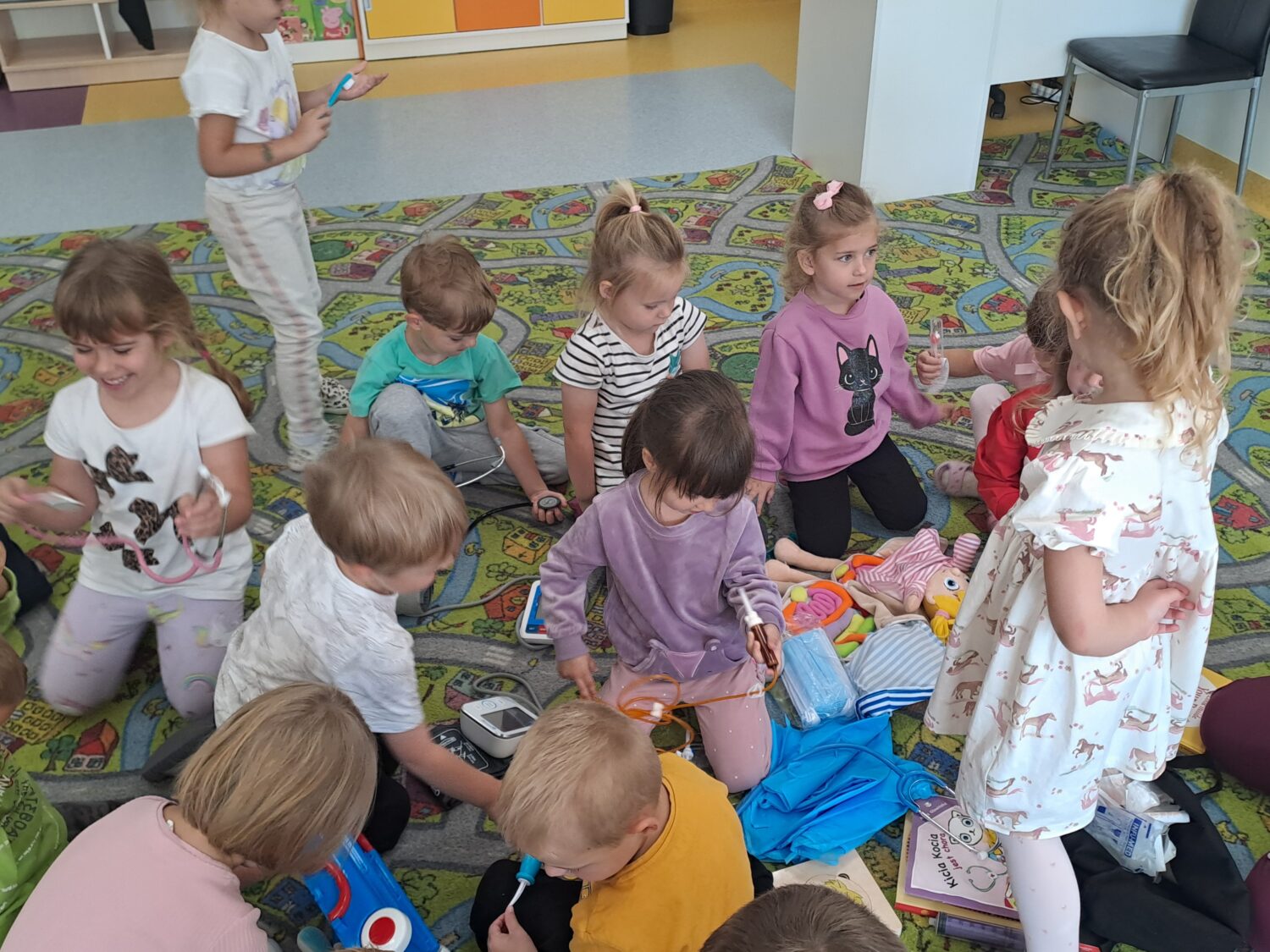 Dziś odwiedziła nas mam Oli, która jest lekarzem. Dzieci miały okazję poznać zawód lekarza oraz dowiedzieć się, jak ważna jest jego praca. Mogły również samodzielnie sprawdzić do czego służą niektóre przyrządy lekarskie i jak bada się ciało człowieka. Była to niezwykle ciekawa i pouczająca lekcja, która wzbudziła w dzieciach duże zainteresowanie.