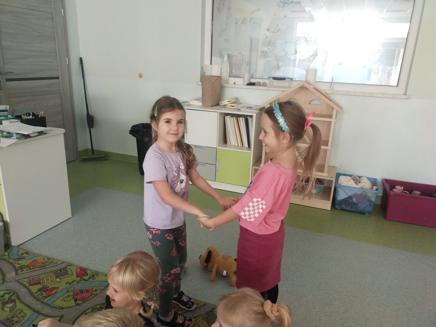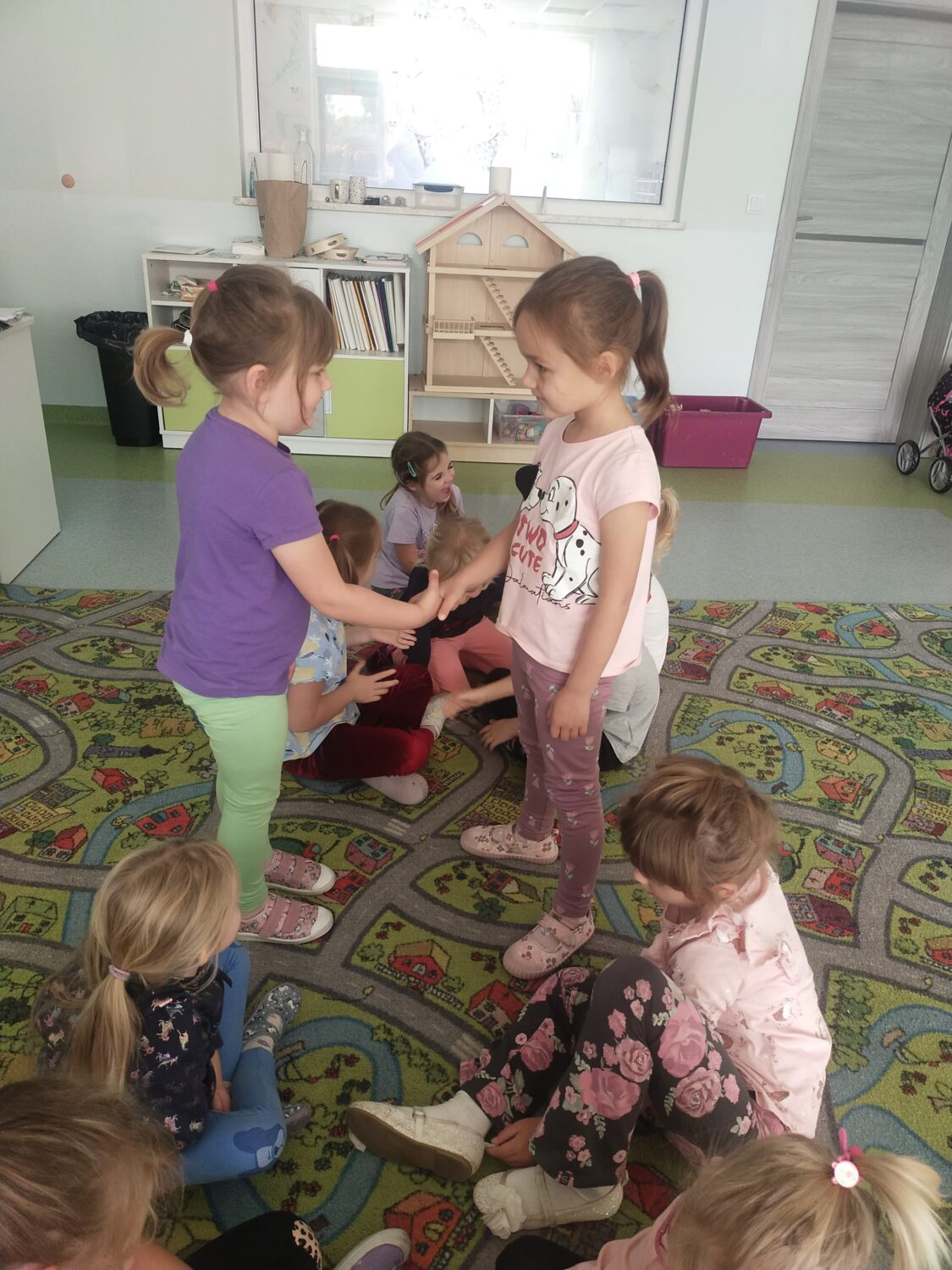 Pszczółki za zajÄ™ciach z jÄ™zyka angielskiego ćwiczyÅ‚y umiejÄ™tność przedstawiania siÄ™ w tym jÄ™zyku. Na poczÄ…tku witaÅ‚y siÄ™ z kolegÄ… lub koleżankÄ… siedzÄ…cÄ… naprzeciwko. NastÄ™pnie powtarzaÅ‚y frazy: „My name is… , What’s your name?”. Po zakoÅ„czonej konwersacji przedszkolaki podawaÅ‚y sobie rÄ™ce, mówiÄ…c: „Nice to meet you”. WczeÅ›niej wysÅ‚uchaÅ‚y wymiany zdaÅ„ pomiÄ™dzy, dobrze im znanymi z programu dwujÄ™zycznoÅ›ci, maskotkami: Tom, Keri, Dog and Cat.
