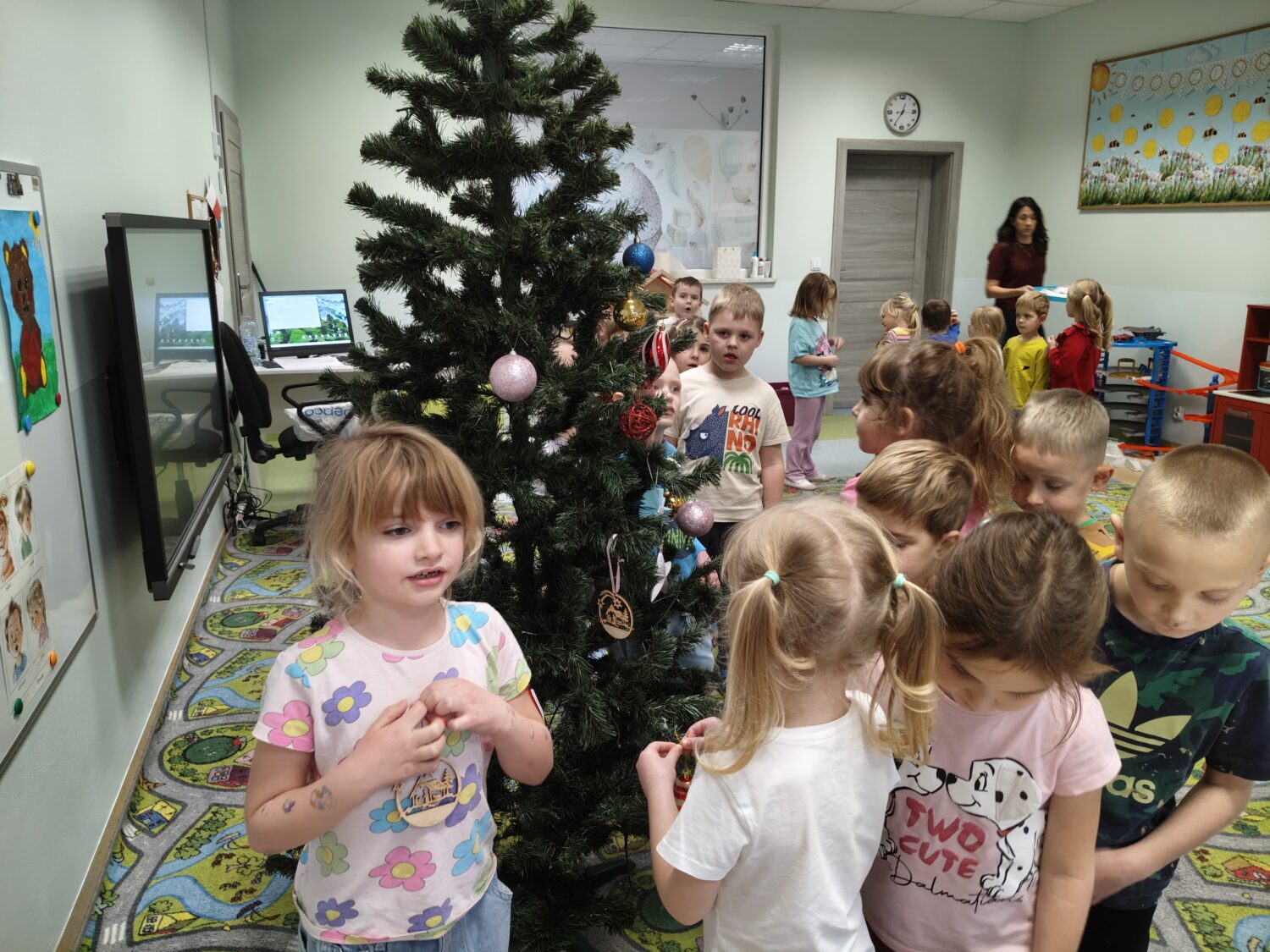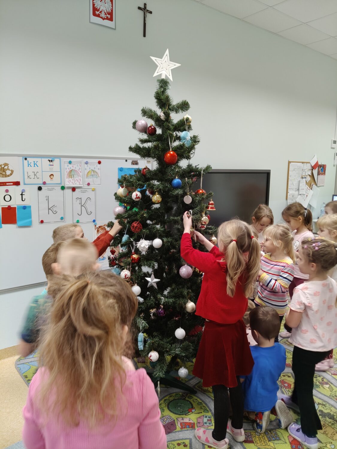 Święta Bożego Narodzenia wiążą się z tradycją ubierania świątecznego drzewka. W naszej grupie Pszczółki  również nie mogło zabraknąć tego rytuału. Dzień ubierania choinki w przedszkolu jest dniem wyjątkowym. Dzieci z wielkim zaangażowaniem zawieszały choinkowe ozdoby: bombki, gwiazdy betlejemskie, złote i czerwone łańcuchy, kolorowe światełka.