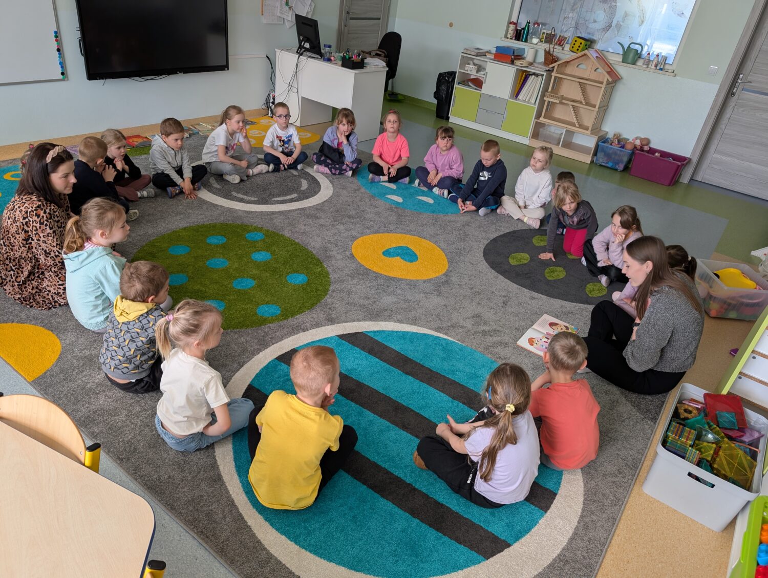 W grupie „Pszczółek” odbyło się wyjątkowe spotkanie czytelnicze. Pani Dorota, mama Klary przeczytała dzieciom książkę pt. „Burza w słoiku”, co spotkało się z ogromnym zainteresowaniem przedszkolaków. Dzieci poznały historię Karolinki, która bardzo lubiła czytać, odwiedzać bibliotekę i malować. W książce zostały przedstawione losy dziewczynki oraz sposoby radzenia sobie ze złością. Był to doskonały sposób stworzenia listy sposobów, w jaki możemy pozbyć się złości. Dzieci miały wiele pomysłów, którymi chętnie dzieliły się z pozostałymi osobami w grupie.